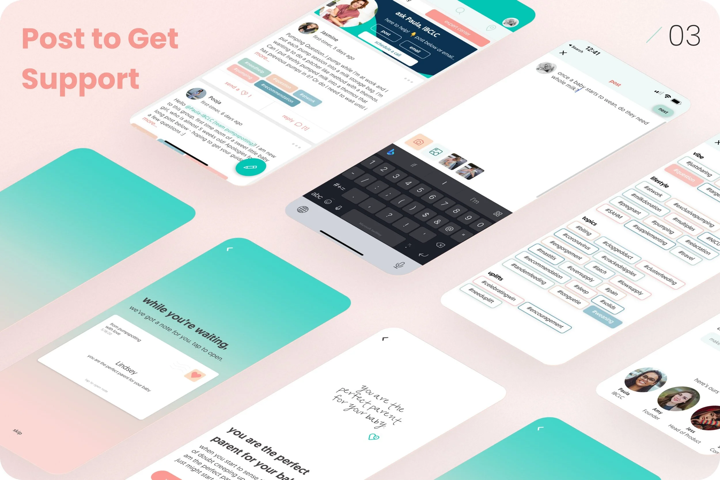 responses from real people—including certified experts like IBCLCs. While waiting for replies, users receive words of encouragement and affirmations to remind them they’re not alone. From thoughtful visual language to gentle interactions, every screen is designed to reduce stress and reinforce connection—because sometimes, the most powerful thing a parent can hear is “me too.”